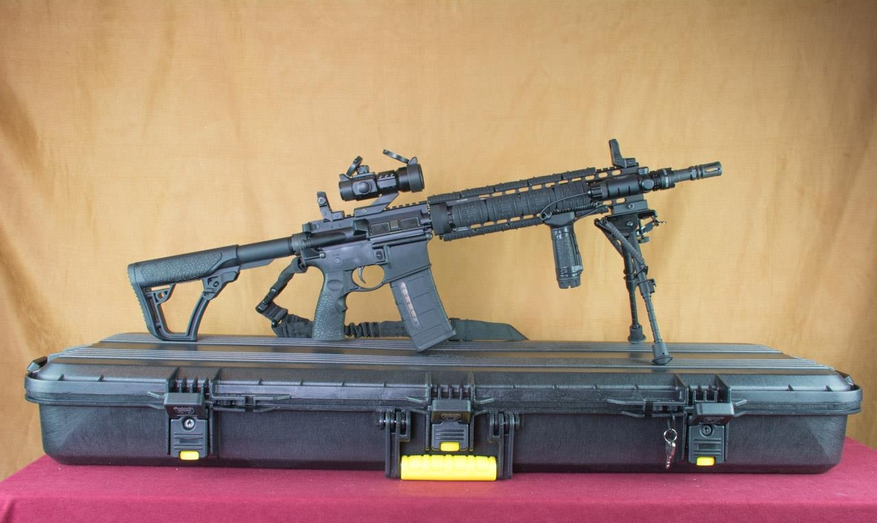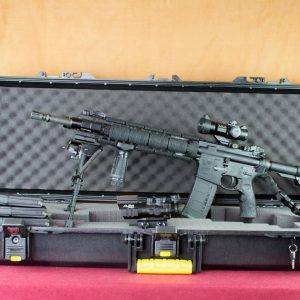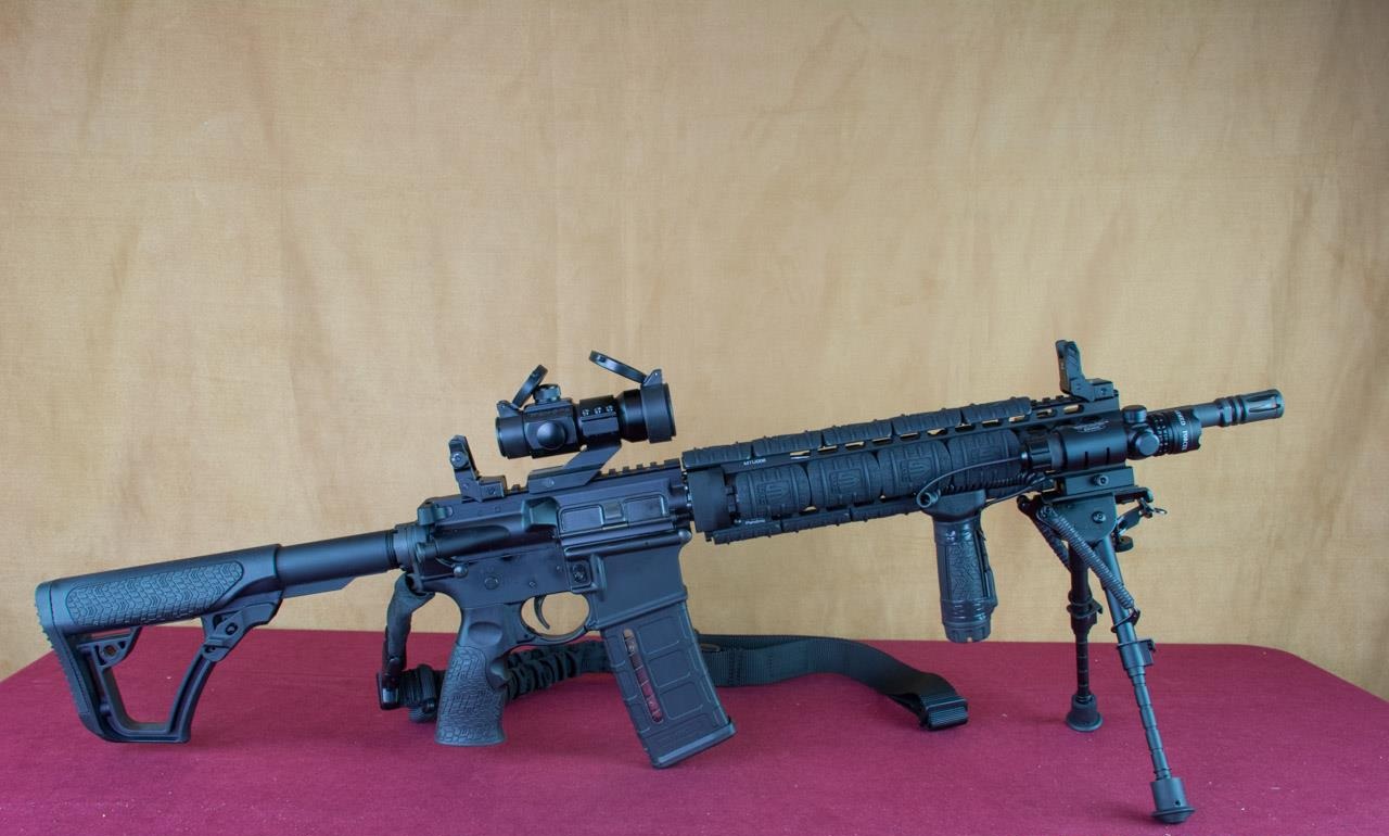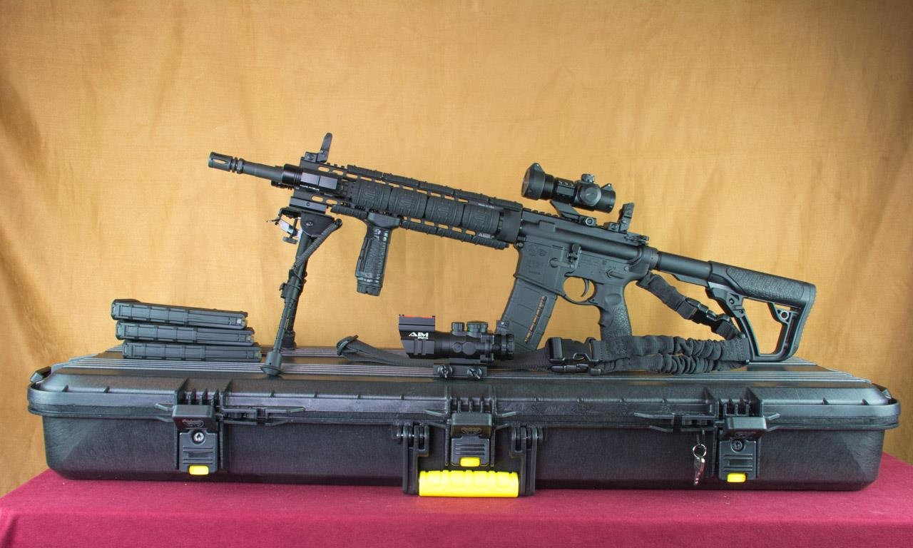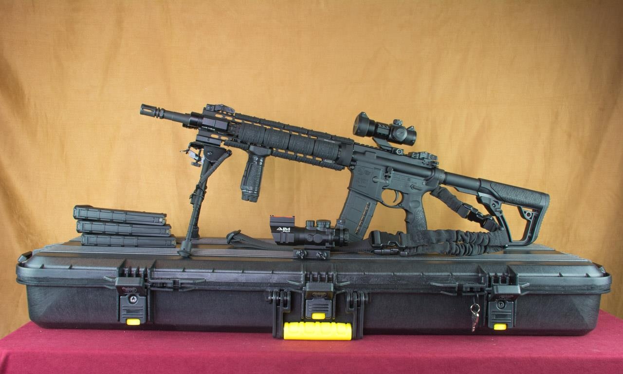 Everything you see: Rifle Rifle Length 13″ Free Float Quadrail UTG Rail Covers Daniel Defense Furniture Kit (Black) Green Laser with Foregrip-mounted Pressure Switch 150-Lumen Flashlight Flip-up Sights Nylong Single-Point Sling 4x Magpul Gen 2 30-rnd Magazines 4×30 Tactical Rifle Scope (red/green/blue illuminated reticle) Plano 42″ Gun-Guard All-Weather Locking Gun Case
