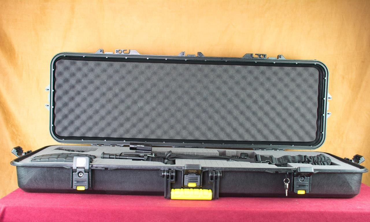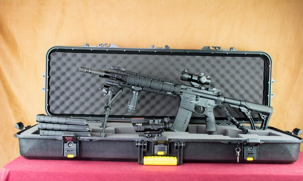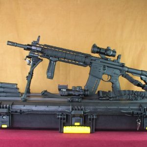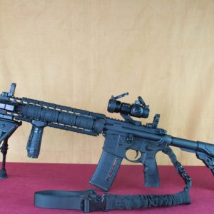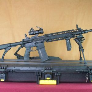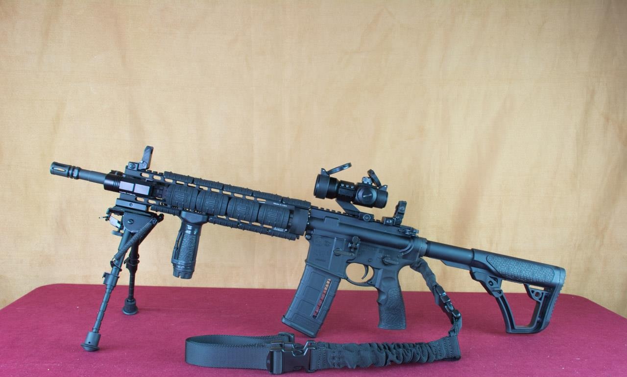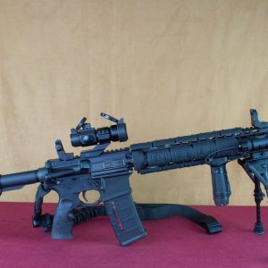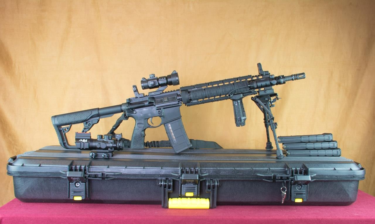 Everything you see: Rifle Rifle Length 13″ Free Float Quadrail UTG Rail Covers Daniel Defense Furniture Kit (Black) Green Laser with Foregrip-mounted Pressure Switch 150-Lumen Flashlight Flip-up Sights Nylong Single-Point Sling 4x Magpul Gen 2 30-rnd Magazines 4×30 Tactical Rifle Scope (red/green/blue illuminated reticle) Plano 42″ Gun-Guard All-Weather Locking Gun Case